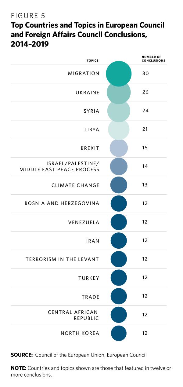 The conclusions of the European Council and the Foreign Affairs Council contained 463 references to non-EU countries in 2014–2019. This was a significant increase on the previous period, when 279 references were recorded, which is quite surprising given that the number of meetings remained roughly the same. One explanation might be that Mogherini, as chair of the Foreign Affairs Council, was particularly averse to controversial debates in the council and therefore put a large number of more consensual topics on the agenda. The fact that in the preceding period the European Council had less time for foreign policy, because it focused almost exclusively on the financial crisis, could also have played a role.