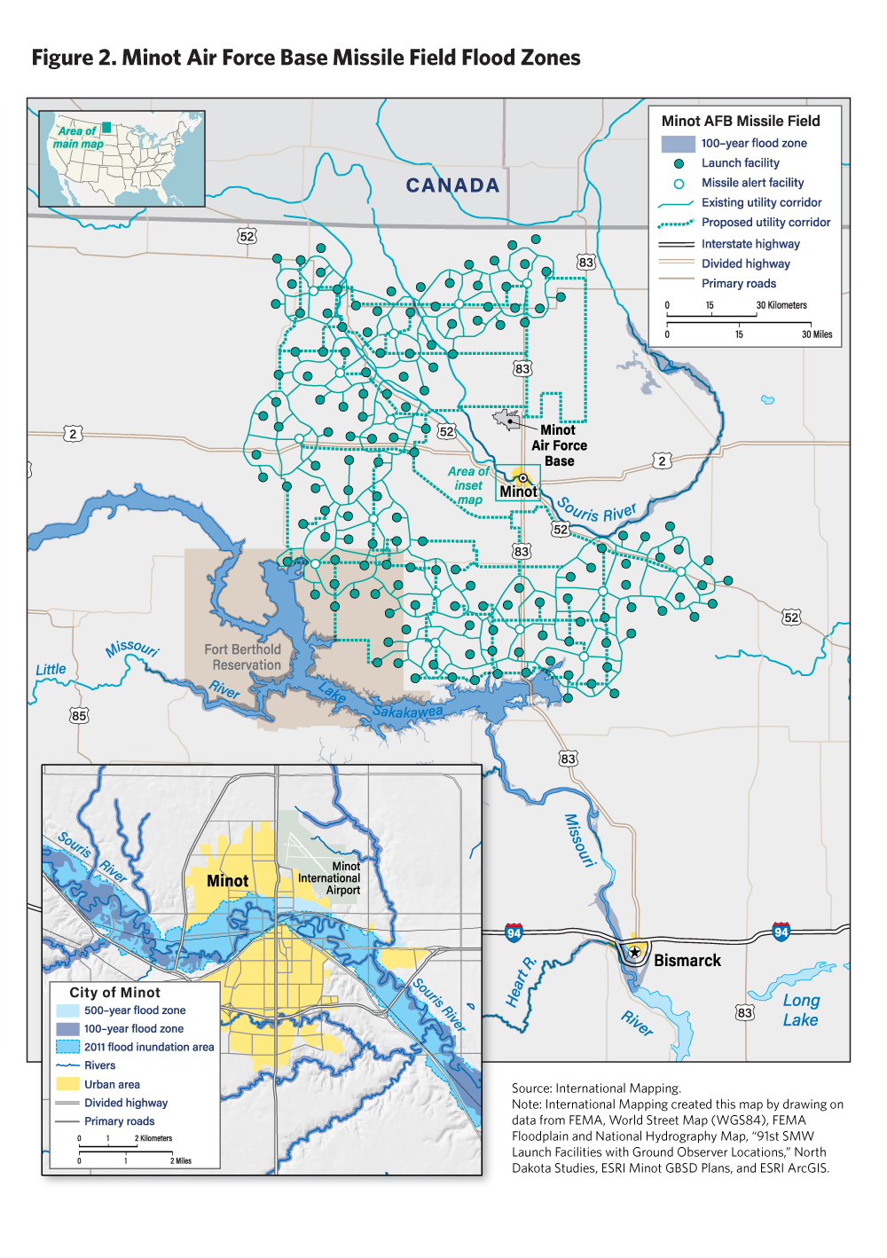 The 2011 Souris River flood is particularly illustrative. Prompted by a confluence of events, including above average snowpack and large rainfall in both Canada and North Dakota, the historic flood inundated the city of Minot. The city is located just 14 miles south of the base and is home to many base personnel, more than a thousand of whom were displaced by the flood.66 While the base managed to avoid significant damage, the flood reportedly made seven LFs inaccessible due to damaged and inundated access roads.67 Additionally, the base, which reportedly draws on the city’s commercial water utilities, had to cut its water consumption in half.68 And even while not directly impacted by the flood, operations at the base and in the missile field were impacted by “localized pooling” around “a handful” of LFs caused by the large winter snowmelt.69 Airmen relied on sandbags and water pumps for months to stave off a serious water infiltration issue. Importantly, this snowmelt challenge suggests that even in the absence of an extreme flood, a smaller set of cascading events could also have damaging impacts.